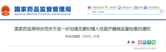 3月27日,國(guó)家藥品監(jiān)督管理局發(fā)布《國(guó)家藥監(jiān)局綜合司關(guān)于進(jìn)一步加強(qiáng)無(wú)菌和植入性醫(yī)療器械監(jiān)督檢查的通知》(藥監(jiān)綜械管〔2019〕25號(hào)),要求各省級(jí)藥監(jiān)進(jìn)一步加強(qiáng)無(wú)菌和植入性醫(yī)療器械監(jiān)督檢查。