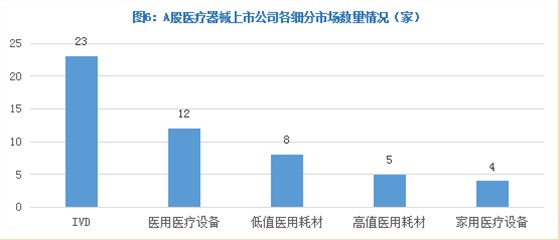 截止2018年12月31日,我國A股市場總計有52家醫(yī)療器械上市公司,IVD市場最多,共有23家上市公司,占比高達(dá)44.23%,其次是醫(yī)用醫(yī)療設(shè)備市場,有12家上市公司,占比23.08%。其中,2018年就有4家醫(yī)療器械公司新上市,分別是邁瑞醫(yī)療、振德醫(yī)療、明德生物和愛朋醫(yī)療。