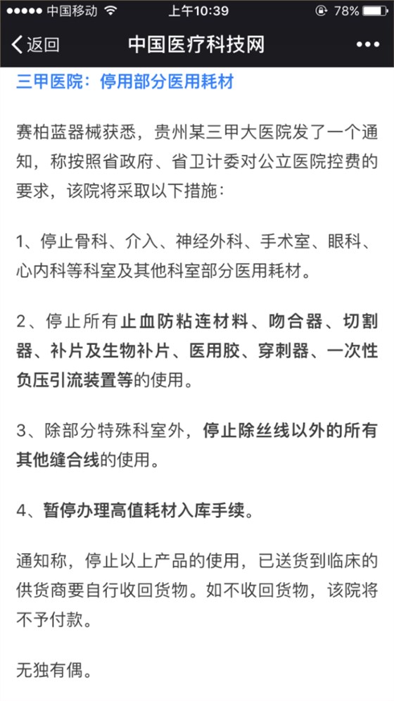 近期,網(wǎng)上一張截圖再一次引爆了醫(yī)療圈的“雷”,四川、貴州、山東等省份要求停用部分醫(yī)用耗材??梢钥吹桨ㄎ呛掀?、切割器、補片等耗材被禁止使用,手術(shù)縫合要求使用絲線,讓行內(nèi)人士不無諷刺說,得了啥病別想著做手術(shù)了,吃點中藥、做個理療沒準(zhǔn)就能好了!
