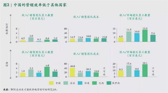 另一方面,我國營銷效率低的現(xiàn)狀也急需改變。根據(jù)BCG數(shù)據(jù)顯示,中國醫(yī)療儀器/耗材的營銷效率低于全球平均水平,甚至低于市場也在不斷增長但成熟度更低的其他金磚國家,尤其是印度。