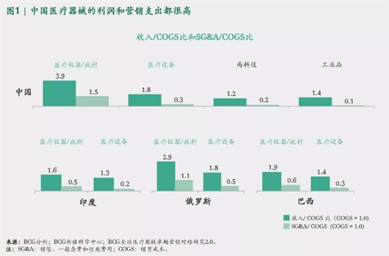 根據(jù)BCG2015年的數(shù)據(jù),中國醫(yī)療儀器/耗材公司的平均銷售、綜合和管理費(fèi)用(SG&A,主要為營銷支出,以銷貨成本的百分比計(jì))超過典型工業(yè)品公司的15倍。雖然醫(yī)療器械行業(yè)正面臨價(jià)格下行的壓力和采購流程急劇變化的威脅,但各項(xiàng)成本卻是居高不下。