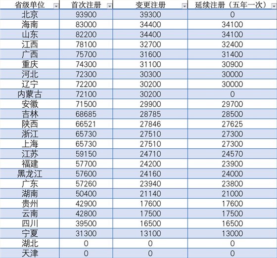 免收注冊費的省級單位有天津和湖北,內(nèi)蒙古自治區(qū)在延續(xù)注冊上也免收。