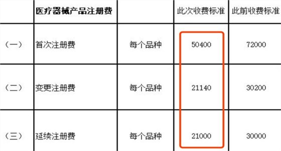 文件里指出,Ⅱ類醫(yī)療器械,每個品種首次注冊費較之前降低21600元,直降30%;變更注冊費較之前降低9060元;延續(xù)注冊費較之前降低9000元。該通知自2019年4月10日起執(zhí)行,有效期五年。